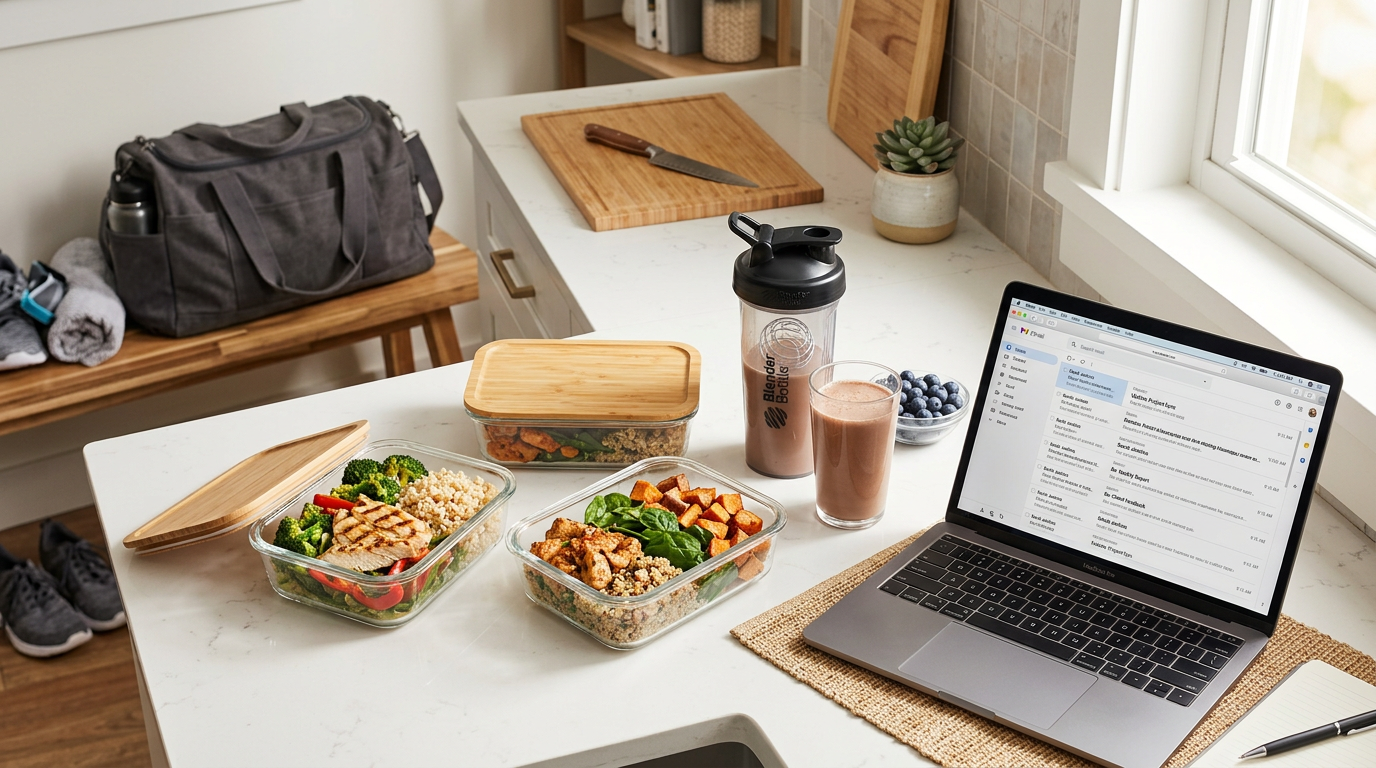 Meal prep containers and a protein shake next to a laptop and gym bag on a kitchen counter